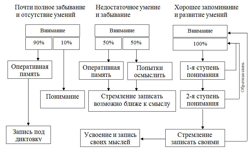 В основном тут действует оперативная память, и запись идет почти под диктовку. При проверке обнаруживается, что школьник многое не понял. Усвоить материал можно и таким образом, что 50 % внимания будет уделено составлению конспекта, 50 % — прослушиванию нового материала без записи. Это весьма распространенная форма. И, наконец, третий вариант. Он реализован в одном из экспериментов, проведенных в Москве. Запись прослушанного не велась. Стопроцентное внимание было сконцентрировано только на понимании. Здесь после изложения материала достигается первая ступень понимания, возникают весьма неопределенные вопросы (стрелки показывают обращение к педагогу), затем непонятный материал повторяется, еще вопросы, потом возникает стремление записать. Через некоторое время опять задают вопросы, и, наконец, усвоение. Итог такой работы — запись усвоенного на «языке собственных мыслей».