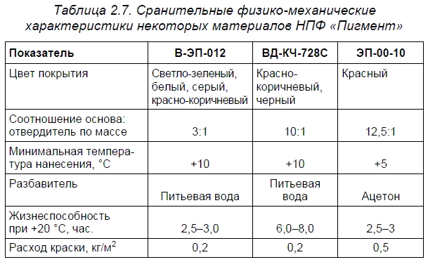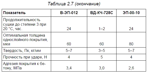 Сравнительные физико-механические характеристики составов В-ЭП-012, ВД-КЧ-728С и эпоксидной грунтовки «ЭП-00-10», широко применяемой в качестве защитного покрытия, приведены в табл. 2.7.