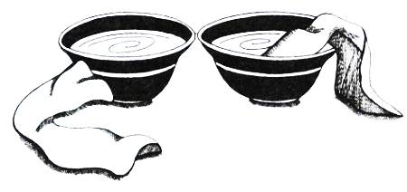Наполните миску водой и поставьте ее на стол. Положите в миску лоскут ткани так, чтобы половина его свисала на стол, а половина находилась внутри под водой. Подождите минуту-другую и замерьте уровень воды. Ткань и бумага очень быстро впитывают воду, которая начнет подниматься по лоскутку, а затем спускаться вниз по его свисающему краю. Останется ли в миске вода, зависит от высоты посуды и от количества воды, которую вы в нее нальете.