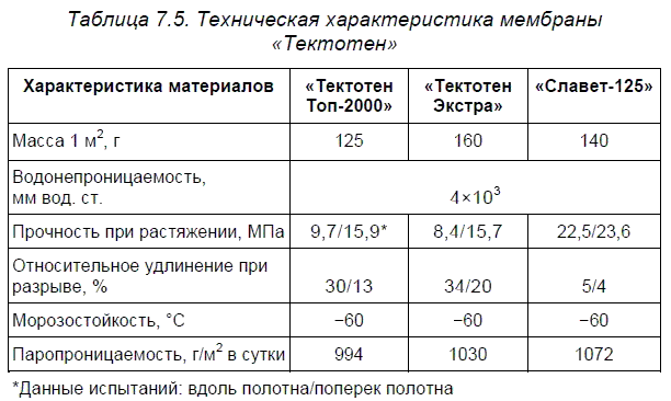 Воздухопроницаемость материала близка к нулю, что предотвращает продувание волокнистых утеплителей. Высокая водонепроницаемость (до 4 м водяного столба) также обусловлена отсутствием микропор. Это является главным отличием от гидро-и ветроизоляционных однослойных мембран, состоящих из тонкого полиэтиленового волокна ПЭНД («Tyvek®») или целлюлозных пропитанных волокон (Сла «вет»), чьи гидроизоляционные свойства обеспечиваются за счет сверхмалого размера пор и гидрофобной поверхности этих волокон. Вода может проникать через такие поры при давлении до 0,01 МПа. Воздухопроницаемость таких мембран составляет 60 и 200 мл/мин., что считалось достаточным для ветрозащиты многих теплоизоляционных конструкций. Сертификационные испытания мембран «Тектотен» приведены в табл. 7.5.