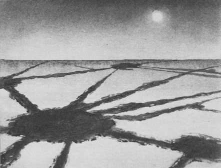 Любопытно, что фотографические наблюдения 1941 года окончательно установили, что поверхность многих марсианских морей сплошь усеяна множеством круглых пятен, очень напоминающих оазисы, что, впрочем, отмечалось и раньше многими опытными наблюдателями. Трудно отделаться от мысли, что эти пятна — такие же населенные пункты, как и оазисы. Скопление же их в морях вполне понятно — ведь именно в этих местах Марса больше всего растительности и влаги. Густо разветвленная, наподобие кровеносных сосудов, сеть каналов в марсианских морях и питает водой покрывающую их растительность.