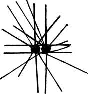 Не менее удивительными образованиями, чем каналы, являются уже упомянутые нами ранее оазисы. Это — круглые пятна растительности, имеющиеся в местах пересечения многих каналов. Их поперечники достигают в среднем около сотни километров. Они являются узловыми точками всей системы каналов. Посмотрите на один из рисунков оазисов. Это двойной оазис, в котором сходятся семь двойных и пять одиночных каналов. Конечно, на рисунке сильно преувеличена прямолинейность этих каналов. Но все же правильность в их расположении и вхождении в оазисы поразительна.