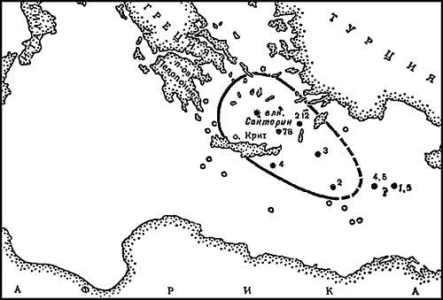 Подчеркнем, что самое сильное (минойское) извержение Санторина не было известно ни в классическую эпоху, ни в средние века. Лишь изучение геологического строения острова Тиры, начатое в конце прошлого века, да недавние океанологические исследования в Восточном Средиземноморье позволили установить это грандиозное геологическое явление.