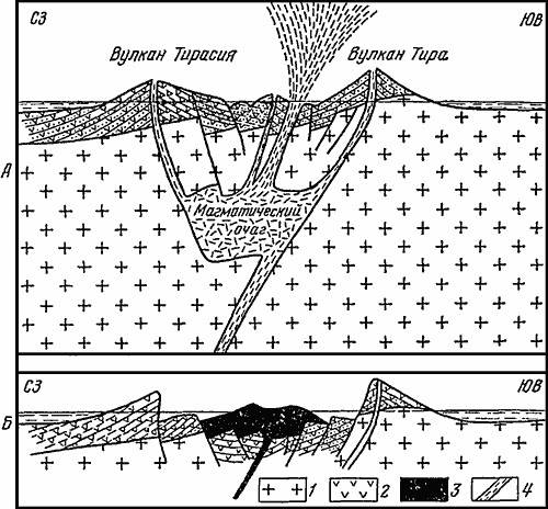 А — в начале минойского извержения. По краям древней кальдеры расположены вулканы. На глубине возник новый магматический очаг. Давление в нем превысило прочность пород и произошел взрыв и выброс раскаленной эмульсии. Б — опорожнившаяся магматическая камера вызвала обрушение ее кровли. На поверхности возникшей кальдеры с 197 г., до н. э. началось образование молодых вулканов. 1 — породы древнего фундамента (сланцы, метаморфизованные известняки); 2 — лавы и туфы доминойских извержений; 3 — лава послеминойских извержений; 4 — разломы