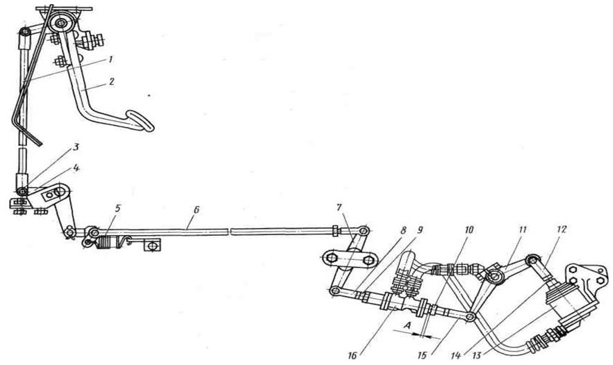 1,6,9 – тяги; 2 – педаль; 3 – палец; 4,7,11 – рычаги; 5 – оттяжная пружина; 8,12,15 – вилки; 10 – стопорное кольцо; 13 – цилиндр; 14 – шток цилиндра; 16 – клапан; А – зазор