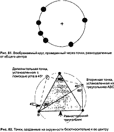 Все точки в круге Марлборо-Даунс равноудалены от общего центра. Я должен был понять, как это было сделано с точки зрения геодезической съемки. Возможны были два основных подхода. Во-первых, все измерения могли производиться из одного общего центра. При условии, что каждая точка находилась на одном и том же расстоянии от центра, все они должны были оказаться на одной окружности. Однако трудно было сделать точно такие измерения. Во-вторых, можно было установить ряд точек, лежавших на одной окружности безотносительно к ее центру. Например, если на местность накладывался равносторонний треугольник, то три его вершины оказывались на окружности скрытого круга — ее всегда можно провести через любые три точки, не находящиеся на одной прямой линии. Затем, если построить прямой угол в одной точке треугольника и провести другую линию из второй точки таким образом, чтобы она разделила пополам противоположную сторону, то точка пересечения этих двух линий также окажется на окружности круга. Это кажется немногосложным, но на рисунке 81 показано, как можно добиться этого. С помощью этого метода можно было установить ряд точек на окружности безотносительно к его центру.