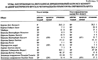 Это датирование примечательно вот еще в каком смысле включили ли землемеры кругов Марлборо-Даунс уже существовавшую структуру в свой план, или расположение церквей было заложено одновременно с сооружением кургана. Ист-Кеннетт был возведен на возвышенном месте, что давало хорошие линии визирования через главные точки западного края восточного круга. В таблице 5 приводятся угловые соотношения между «центром» и курганом Ист-Кеннетт с различными объектами восточного круга.