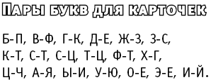 Материал: коробка с голубыми и розовыми карточками, на которых написаны пары букв. На каждой по две буквы, причем одна написана черным карандашом, другая – красным. На голубом фоне – гласные, на розовом – согласные.