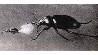 Жук-бомбардир отстреливается от преследующей его жужелицы.