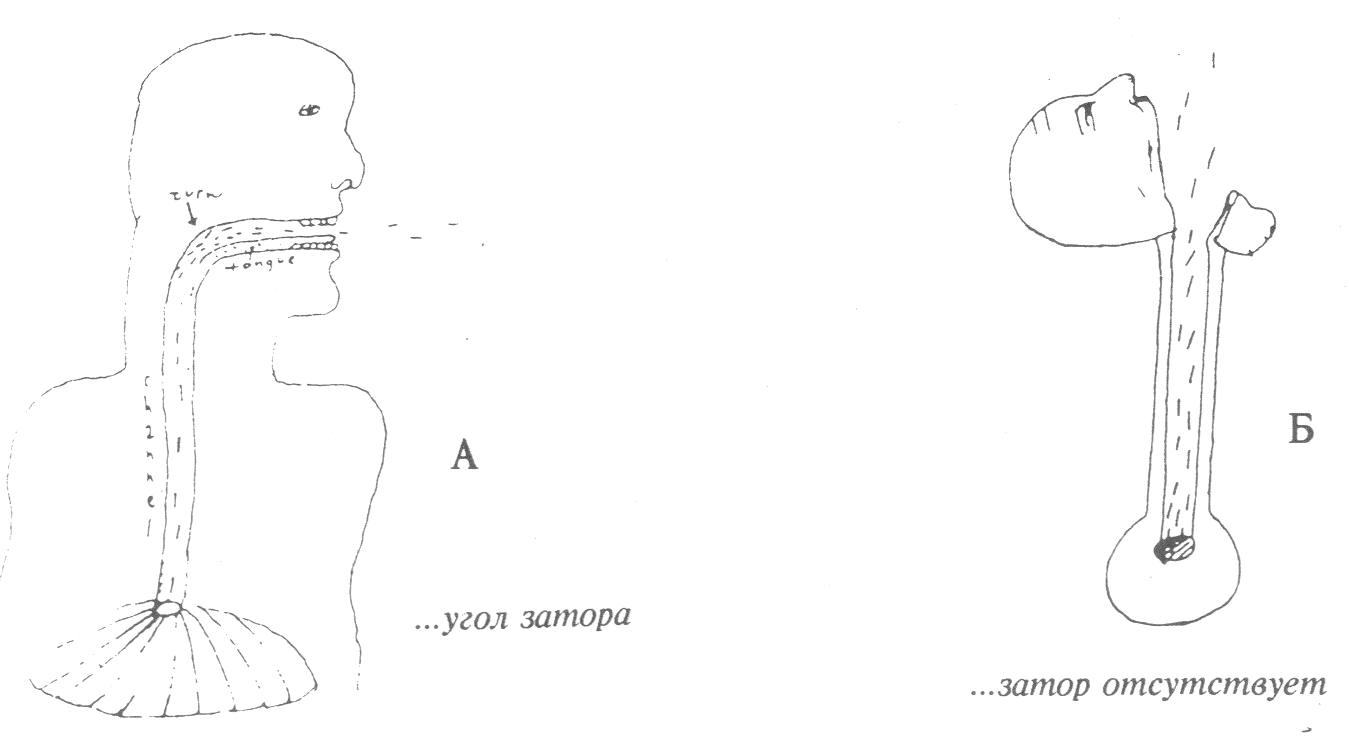 Пусть Ваше внимание будет направлено к тому месту, где горло переходит в ротовую полость. Когда мягкое нёбо лениво, а язык напряжен, эта область становится затором для звука (рис. А). В рабочих целях представьте себе переход из ротовой полости к диафрагме в виде широкого, незаблокированного пути.