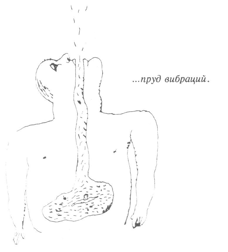 Запрокиньте, как прежде, голову назад. Представьте, что челюсть и язык принадлежат передней части тела, а мягкое нёбо и череп — задней. Между передней и задней частью вообразите широкую расщелину. В самой глубине этой "расщелины" находится теплый "пруд", наполненный вибрациями. Освободите вибрации из "пруда", чтобы они, как гейзер, поднялись сквозь "расщелину" на "хаааааааа".