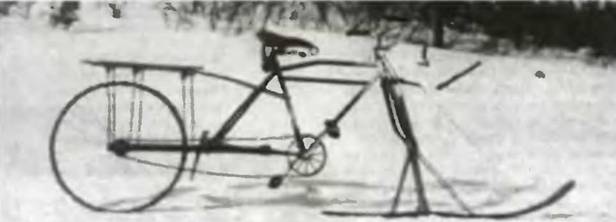 Ну и что же здесь особенного? Ездят же на снегоходах, а совсем недавно ездили на аэросанях. Конечно, можно прокатиться и на велосипеде, поставив вместо переднего колеса лыжу. Но дело в том, что именно на велосипеде, который вы видите на снимке, американец Джордж Пилчер в 1908 году совершил небывалое до тех пор зимнее путешествие по Аляске. Из города Нам, расположенного на берегу залива Нортон, он доехал на нем до своей хижины, построенной в нижнем течении реки Юкон, преодолев более восьмисот километров довольно сложного пути.