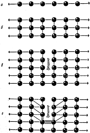 Взяв еще несколько таких же цепочек и расположив их так, чтобы они образовали кристалл (рис. 18, б), мы увидим, что пока еще ничто не мешает каждой цепочке в отдельности нести ее полное теоретическое напряжение. Предположим далее, что мы перерезали несколько соседних межатомных связей, то есть создали трещину (рис. 18, в). Разумеется, разорванные цепочки уже не смогут, как прежде, нести нагрузку, передавая ее от атома к атому. Теперь эту работу должны взять на себя оставшиеся цепочки. И сила как бы обходит трещину по самому ее краю. Таким образом, почти вся нагрузка, которую несли разрезанные атомные цепочки, падает теперь на единственную атомную связь у самого кончика трещины (рис. 18, г). Ясно, что при подобных обстоятельствах перегруженная связь порвется раньше всех других. Когда же такое перегруженное звено лопнет, положение не изменится к лучшему. Напротив, оно ухудшится, так как на долю соседнего звена добавится не только нагрузка перерезанных с самого начала цепочек (при создании трещин), но еще и та доля нагрузки, которая приходилась на только что лопнувшую цепочку. Таким образом, трещина в кристалле оказывается инструментом, с помощью которого приложенная извне слабая сила рвет поочередно одну за другой прочнейшие межатомные связи. Так трещина и бежит по материалу, пока не разрушит его до конца.