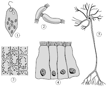 Рис. 47. Разнообразие клеток: 1 – эвглена зеленая; 2 – бактерия; 3 – растительная клетка мякоти листа; 4 – эпителиальная клетка; 5 – нервная клетка