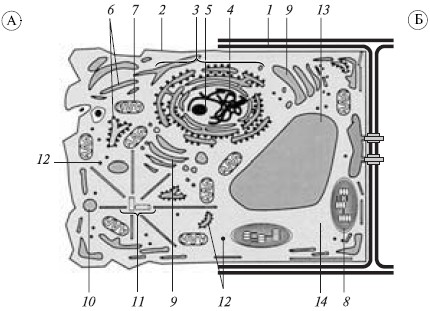 Рис. 48. Комбинированная схема строения животной (А) и растительной (Б) клетки: 1– оболочка; 2 – наружная клеточная мембрана; 3 – ядро; 4 – хроматин; 5 – ядрышко; 6 – эндоплазматическая сеть (гладкая и гранулярная); 7 – митохондрии; 8 – хлоропласты; 9 – аппарат Гольджи; 10 – лизосома; 11 – клеточный центр; 12 – рибосомы; 13 – вакуоль; 14 – цитоплазма