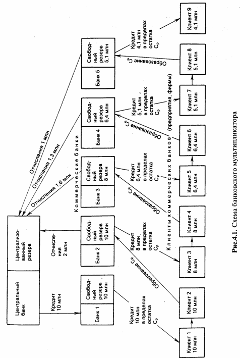 В соответствии со схемой деньги на расчетных счетах клиентов 2, 4, 6, 8 и т. д. (всех четных клиентов) остаются нетронутыми и поэтому общая сумма денег на расчетных (депозитных) счетах составит в конечном счете величину, многократно большую, чем первоначальный депозит - 10 млн руб., образовавшийся при выдаче ссуды клиенту 1. Однако деньги на депозитных счетах могут увеличиться не более чем в 5 раз, поскольку величина коэффициента мультипликации, представляющая собой отношение образовавшейся денежной массы на депозитных счетах к величине первоначального депозита, обратно пропорциональна норме отчислений в централизованный резерв.