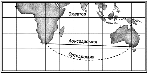 Рис. 1. На морской карте кратчайший путь от мыса Доброй Надежды до южной оконечности Австралии обозначается не прямой линией («локсодромией»), а кривой («ортодромией»)
