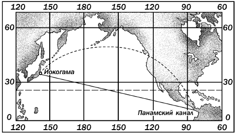 Рис. 2. Кажется невероятным, что криволинейный путь, соединяющий на морской карте Иокогаму с Панамским каналом, короче прямой линии, проведенной между теми же точками