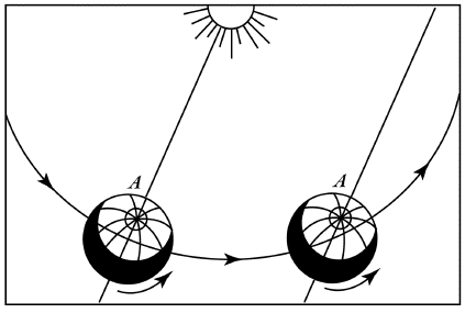 Часы наши регулируются не по реальному Солнцу, а по некоему воображаемому солнцу, которое не светит, не греет, а придумано только для правильного счета времени. Представьте себе, что в природе существует небесное светило, которое движется в течение всего года равномерно, обходя Землю ровно во столько же времени, во сколько обходит вокруг Земли – конечно, кажущимся образом – наше подлинно существующее Солнце. Это созданное воображением светило в астрономии именуется «средним солнцем». Момент прохождения его через линию зенит – юг называется «средним полуднем»; промежуток между двумя средними полуднями есть «средние солнечные сутки», а время, так исчисляемое, называется «средним солнечным временем». Карманные и стенные часы идут именно по этому среднему солнечному времени, между тем как солнечные часы, в которых стрелкой служит тень стерженька, показывают истинное солнечное время для данного места. У читателя после сказанного составилось, вероятно, такое представление, что неравенство истинных солнечных суток вызвано неравномерным вращением Земли вокруг своей оси. Земля действительно вращается неравномерно, но неравенство суток обусловлено неравномерностью другого движения Земли, а именно – ее движения по орбите вокруг Солнца. Мы сейчас поймем, как это может отразиться на длине суток. На рис. 6 вы видите два последовательных положения земного шара. Рассмотрим левое положение. Стрелки внизу показывают, в каком направлении Земля вращается вокруг оси: против часовой стрелки, если смотреть на северный полюс. В точке A теперь полдень: эта точка лежит как раз против Солнца. Представьте себе теперь, что Земля сделала один полный оборот вокруг оси; за это время она успела переместиться по орбите направо и заняла другое место. Радиус Земли, проведенный в точке A, имеет такое же направление, как и сутки назад, но точка A оказывается уже лежащей не прямо против Солнца. Для человека, стоящего в точке A, полдень еще не наступил: Солнце левее прочерченной линии. Земле надо вращаться еще несколько минут, чтобы в точке A наступил новый полдень.