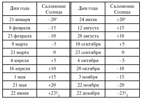 Чтобы пользоваться чертежом, надо знать, как велико угловое расстояние («склонение») Солнца от экватора в ту или иную сторону для различных дней года. Соответствующие данные указаны в табличке на стр. 28.