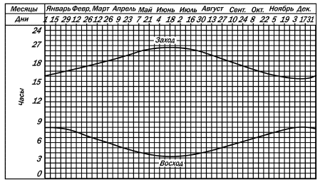 Рис. 9. График восхода и захода Солнца в течение года для 50-й параллели