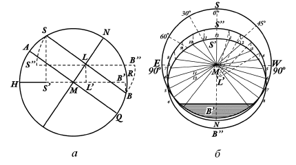 Рис. 8. Чертеж для графического определения продолжительности дня (Подробности в тексте)