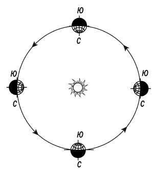 Мы знаем теперь, в чем может сказаться для нас эксцентрическое положение Солнца в земной орбите: в том прежде всего, что зима северного полушария должна быть короче и мягче, а лето – длиннее, чем в южном. Наблюдается ли это в действительности? Безусловно. Земля в январе ближе к Солнцу, чем в июле на 2х1/60, т.е. на 1/30; количество получаемого от него тепла возрастает поэтому в (61/59)2 раз, т.е. на 6%. Это несколько смягчает суровость северных зим. С другой стороны, северные осень и зима вместе примерно на 8 суток короче южных; лето северного полушария вместе с весной на столько же длиннее, чем в южном. Большее обледенение южного полюса объясняется, вероятно, этим обстоятельством. Вот точная продолжительность времен года в северном и в южном полушариях: