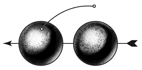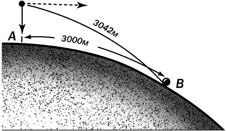 Первое перемещение равно 0,5 км. Второе – за 10 секунд времени падения тела – равно по широте Москвы 0,3x10 = 3 км. Третье движение – самое быстрое – 30 км в одну секунду. За 10 с, пока длится падение, тело переместится по земной орбите на 300 км. По сравнению со столь значительным перемещением оба предыдущих движения – ? км вниз и 3 км в сторону – будут едва заметны; наблюдая с Солнца, мы обратим внимание лишь на самое значительное перемещение. Что же мы увидим? Примерно то, что показано (без соблюдения масштаба) на рис. 27. Земля переместится налево, а падающее тело – из точки на Земле в правом положении в соответствующую точку (только чуть пониже) на Земле в левом положении. На рисунке, мы сказали, масштаб не соблюден: центр Земли за 10 сек. передвинется не на 14 000 км, как изобразил для наглядности художник, а только на 300 км.