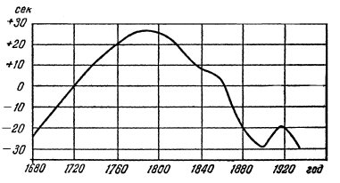 Размер уклонений Земли от строго равномерного (в указанном смысле) вращения весьма невелик: в течение целого столетия от 1680 до 1780 г. Земля вращалась замедленно, сутки удлинялись, и планета наша накопила около 30 с. разницы между «своим» и «чужим» временем; затем до начала XIX в. сутки укорачивались, в первые же 20 лет XX в. движение Земли снова замедлялось, сутки опять стали удлиняться, а затем вновь стали укорачиваться (рис. 29).