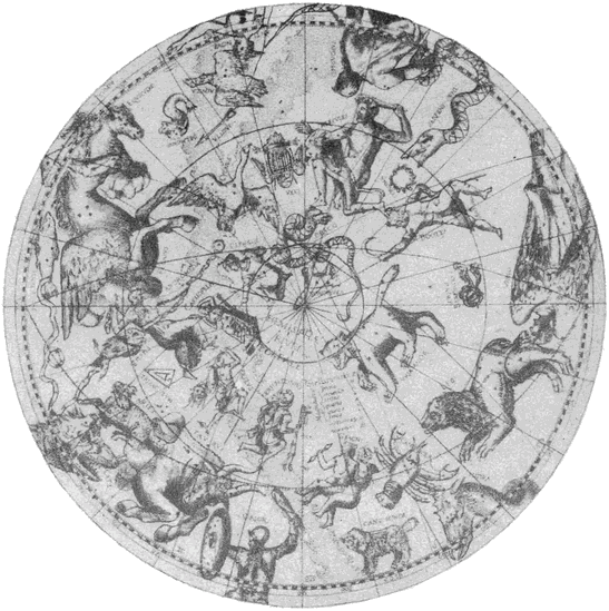 Старинная звездная карта с изображением фигур созвездий. Названия созвездий написаны по-латыни.