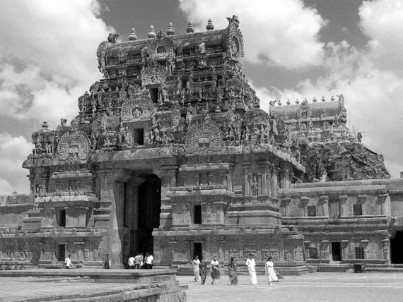 Большой храм Брихадисвара в Танджуре (Танджавуре) был сооружен между 1003 и 1010 гг., во времена правления царя Раджараджи, основателя империи Чола. Окруженный двумя стенами, имеющими в плане форму квадрата, этот храм (построенный из гранитных блоков и частично из кирпича) увенчан пирамидальной 13-ярусной башней – «виманой», имеющей высоту 61 м, с монолитом-луковкой на вершине. Стены храма богато украшены скульптурой.