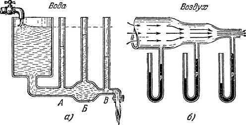 То же самое можно наблюдать и при течении воздуха по трубке переменного сечения (рис. 9, б). Манометры и здесь покажут, что давление уменьшается при сужении струи, то есть при увеличении скорости течения воздуха.