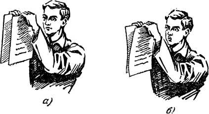 Возьмите два листа писчей бумаги, держа их параллельно (рис. 10, а), дуньте в промежуток между ними.