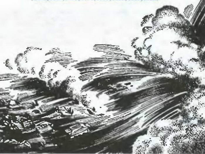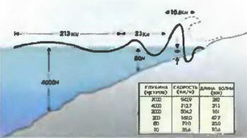 — Да, это действительно так. Высота волны в океане составляет очень небольшую величину — порядка 1 метра. Но когда цунами большой длины выходит на мелководную шельфовую зону и начинает проникать в береговой клин, она тормозится, вся ее энергия концентрируется. И волна гигантской стеной с огромной силой обрушивается на побережье.