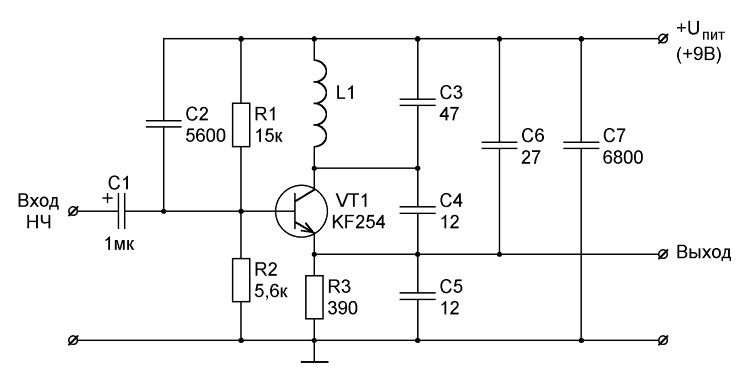 Модулирующий НЧ-сигнал подается на базу транзистора VT1 через разделительный конденсатор С1. В соответствии с мгновенным значением этого сигнала изменяется величина напряжения смещения, подаваемого на базу транзистора VT1, то есть изменяется положение рабочей точки транзистора. В результате НЧ-сигнал, формируемый на коллекторе транзистора VT1, инициирует изменение падения напряжения на резонансном контуре, при этом по закону модулирующего сигнала происходит изменение амплитуды и частоты сигнала ВЧ-генератора. Таким образом, на коллекторе транзистора VT1 формируется модулированный сигнал.