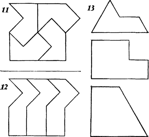 Если конгруэнтные части по форме не должны повторять составленную из них фигуру, то возможности для придумывания задач-головоломок расширяются. Например, Т-образная фигура на рис. 14 составлена из 5 квадратов. Ее невозможно разрезать на четыре Т-образные фигуры, но, может быть, вам удастся разбить ее на 4 конгруэнтные фигуры какой-нибудь другой формы?