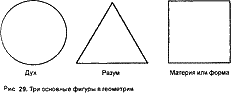 В религиозной традиции центральными являются три основные геометрические фигуры, круг, треугольник и квадрат (рис. 29). Считалось, что они представляют три уровня нашего бытия: дух, разум и тело. Никому не известно, кто первым использовал циркуль, как и системы счета. Вероятно, первоначально речь шла о шнурке на двух колышках, которые и проложили путь символическому исследованию царства идей и форм. Все правильные геометрические фигуры могут быть получены с помощью циркуля Бога, которого порой называли «Великим Геометром», часто изображали пользующимся циркулем.
