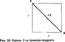 Поскольку отдельные числа являются либо рациональными (целые числа), либо иррациональными (дробные числа), геометрия может навести мосты между ними. Круг может представлять как принцип рационального целого числа в своем диаметре, так и иррациональную функцию в своей окружности. Квадрат и его диагональ также дают похожий феномен. Например, диагональ квадрата со стороной, равной одной единице, равна корню квадратному из 2 (рис. 33).