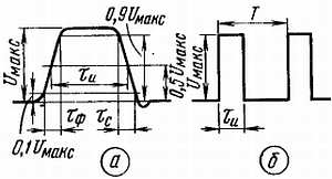 Один из параметров импульса — его амплитуда (Uмакс), наибольшая высота импульса без учета небольших выбросов. Продолжительность нарастания импульса характеризует длительность фронта τф, а убывания — длительность спада τс. Продолжительность же «жизни» импульса определяет длительность τи — время между началом и концом импульса, отсчитываемое обычно на уровне 0,5 амплитуды (иногда на уровне 0,7).