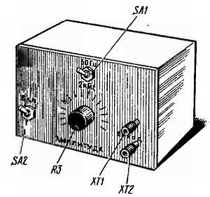 В итоге с зажимов ХТ1 и ХТ2 можно снимать прямоугольные импульсы амплитудой от нескольких десятков милливольт до единиц вольт. Если по каким-либо причинам даже минимального сигнала окажется в избытке (например, при проверке весьма чувствительного усилителя), выходной сигнал можно уменьшить либо включением между верхним по схеме выводом резистора R3 и эмиттером транзистора постоянного резистора сопротивлением 1…3 кОм, либо применением внешнего делителя напряжения.