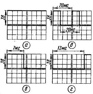 Затем при этой же длительности развертки установите синхронизацию отрицательным сигналом, повернув ручку «СИНХР.» в крайнее положение против часовой стрелки. На экране увидите изображение паузы (рис. 62, г), поскольку развертка осциллографа запускается теперь спадом импульса. Длина линии 6,5 деления, значит, длительность паузы равна 13 мс. Сумма длительностей импульса и паузы составит значение периода повторения импульсов (20 мс).