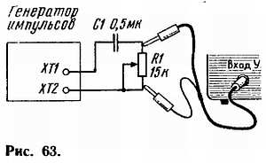 Сначала подключите к выходу генератора дифференцирующую цепь, составленную из конденсатора и переменного резистора (рис. 63).