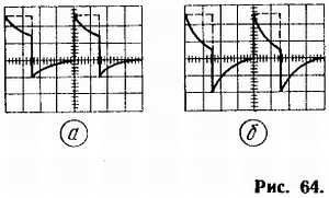 Движок резистора поставьте в нижнее по схеме положение, а на генераторе установите диапазон «50 Гц» и максимальную амплитуду выходного сигнала. При этом на экране осциллографа (он работает в ждущем режиме с синхронизацией от положительного сигнала, длительность развертки — 5 мс/дел., чувствительность — 1 В/дел.) увидите изображение импульсов со скошенной вершиной (рис. 64, а). Нетрудно заметить, что импульс как бы опустился по линии спада, из-за чего увеличился размах изображения.