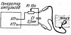 Налаживание делителя весьма упрощено благодаря использованию нашего генератора импульсов. Его сигнал подают на гнездо ХР1 делителя и «земляной» щуп осциллографа. Вначале устанавливают на генераторе диапазон «50 Гц», на осциллографе включают ждущий режим и открытый вход. Касаются входным щупом осциллографа щупа ХР1 делителя (или зажима ХТ1 генератора). Подбором чувствительности осциллографа и амплитуды выходного сигнала генератора добиваются размаха изображения, равного, скажем, четырем делениям.