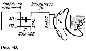 Для примера можете исследовать усилитель 3Ч с темброблоком (либо другой широкополосный усилитель). Его соединяют с генератором и осциллографом в соответствии с рис. 67.