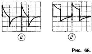 Картина на экране осциллографа, подключенного к эквиваленту нагрузки, может соответствовать показанной на рис. 68, а, что будет свидетельствовать о недостаточной емкости разделительных конденсаторов между усилительными каскадами или конденсатора на выходе усилителя, если через него подключена нагрузка.