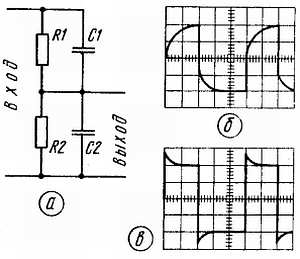 И еще об одном примере применения прямоугольных импульсов — для настройки широкополосных делителей напряжения. Такой делитель, например, стоит в нашем осциллографе, он может быть в вольтметре или милливольтметре переменного тока. Поскольку полоса частот намеряемых сигналов может быть весьма широкой (от единиц до миллионов герц), делитель должен эти сигналы пропускать с одинаковым ослаблением. Иначе неизбежны ошибки в измерении.