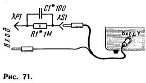 Делитель образован всего двумя деталями (рис. 71), составляющими верхнее плечо предыдущей схемы. Нижнее же плечо сосредоточено в самом осциллографе — это его входное сопротивление и суммарная входная емкость, включая емкость выносного кабеля со щупами.