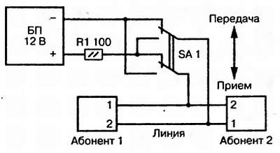 Как видно, клеммами питания аппараты соединяются противоположно: когда на клемму 1 аппарата первого абонента подается плюс питания, на эту же клемму второго аппарата поступает минус, и наоборот.