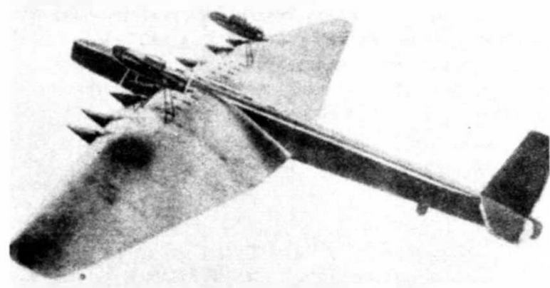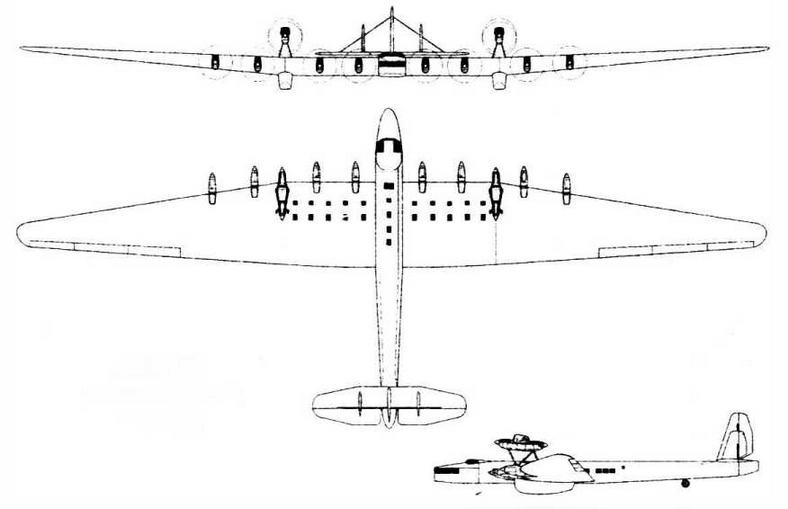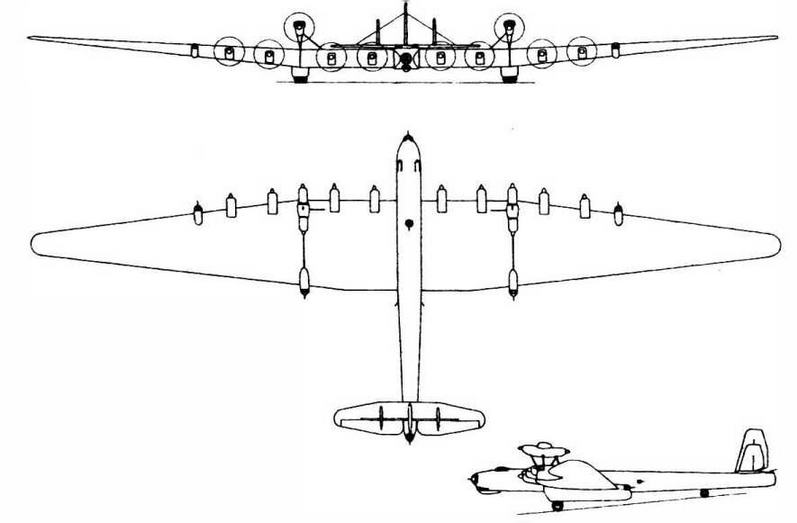 Восемь моторов разместили на передней кромке крыла и еще четыре — в двух тандемных установках сверху на фермах, но не над фюзеляжем, а над крылом. Размах крыла — 95 м, взлетный вес — около 70 т. Оперение выполнили трехкилевым — возможно, побоялись, что один огромный киль станет очень сложен в изготовлении и техническом обслуживании. Большой киль крепился к фюзеляжу, а два поменьше стояли на стабилизаторе примерно в трети размаха от него.